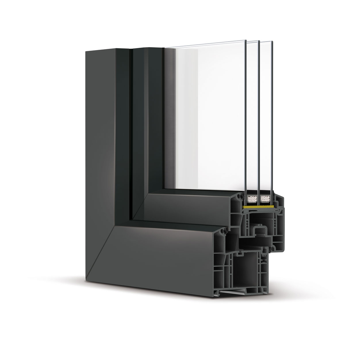 Durch den hohen Glasfaseranteil im Fensterflügel werden selbst geschosshohe Fensterelemente bis 2,80 m funktionssicher realisiert. Eröffnen Sie sich neue architektonische Möglichkeiten mit einem Maximum an natürlichem Licht. Besonders schlanke Profile vergrößern die Fensterflächen zusätzlich.